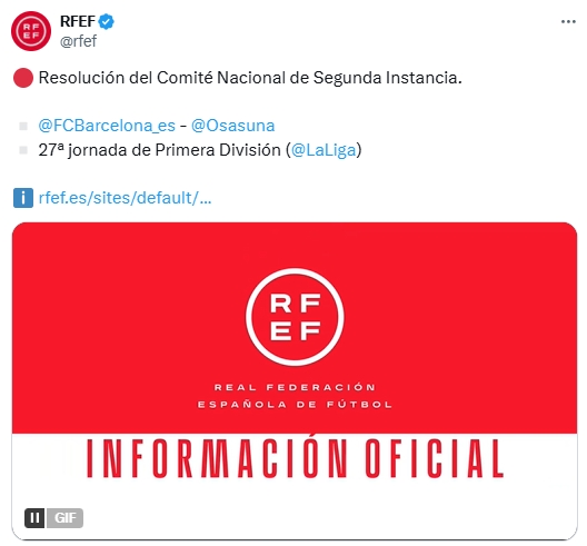 西足協(xié)表示,巴薩和奧薩蘇納均已損害競(jìng)技利益的理由進(jìn)行上訴。但國(guó)家隊(duì)征召不構(gòu)成改期充分理由,只要俱樂部有足夠球員參賽即可。而巴薩和奧薩蘇納提議的日期均附加條件(如歐冠出局),可能引發(fā)賽程不確定性,違反賽程的“確定性原則”。考慮到奧薩蘇納vs畢爾巴鄂和vs巴薩的比賽僅相隔1天,西足協(xié)同意將奧薩蘇納vs畢爾巴鄂的比賽從28日改至30日。