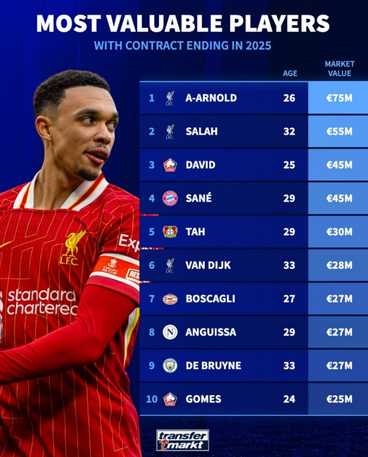 3月20日訊 德轉(zhuǎn)盤(pán)點(diǎn)了目前合同將在今年到期的球員中身價(jià)最高榜單,其中阿諾德最高,利物浦三人都在前十,具體如下: