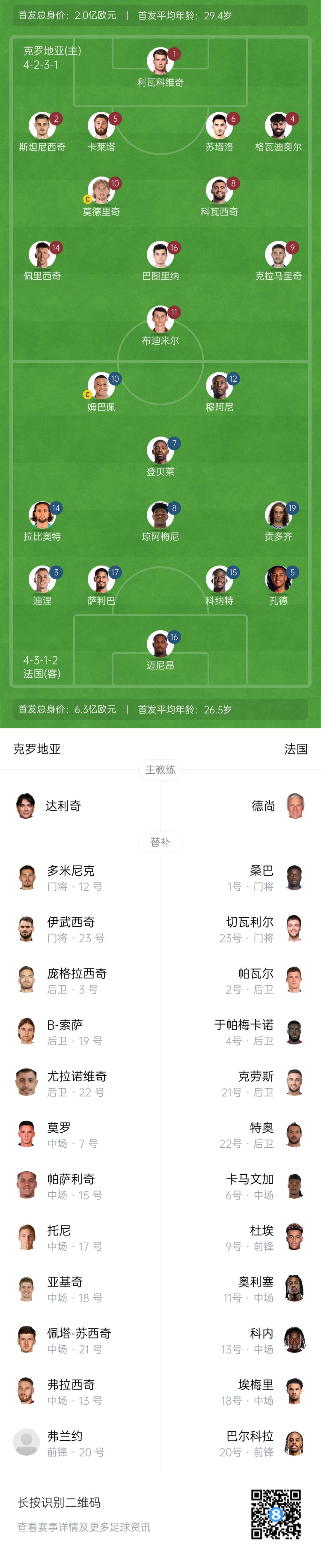 3月21日訊 北京時間03:45,歐國聯(lián)1/4賽決賽首回合,克羅地亞坐鎮(zhèn)主場迎戰(zhàn)法國。賽前官方公布了雙方的首發(fā)名單。