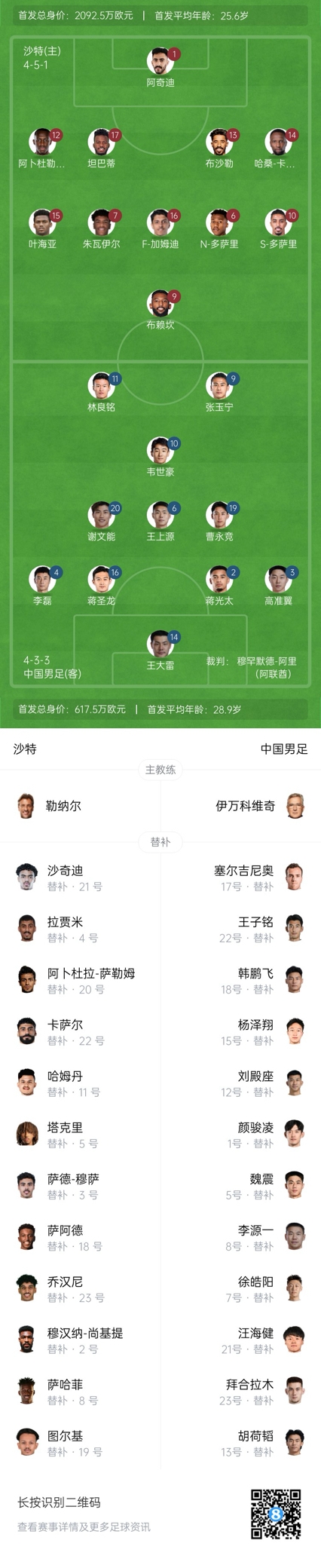 沙特替補(bǔ):21-哈米德-尚基提、22-艾哈邁德-卡薩爾、2-穆漢納-尚基提、3-薩阿德-穆薩、4-阿里-拉賈米、5-吉哈德-薩克里、23-齊亞德-喬漢尼、8-馬爾萬(wàn)-薩哈菲、11-阿卜杜拉-哈姆丹、18-穆哈納德-薩阿德、19-圖爾基-阿馬爾、20-阿卜杜拉-薩利姆