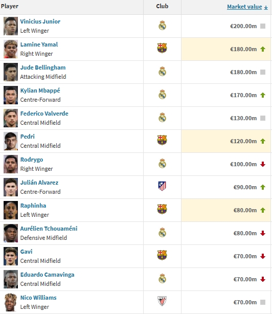 03月21日訊 今日德轉(zhuǎn)更新西甲身價(jià),維尼修斯2億,亞馬爾、貝林厄姆1.8億不變,姆巴佩&小蜘蛛上漲1000萬,佩德里漲至1.2億歐