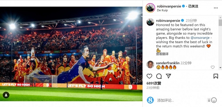 范佩西在社交媒體上曬出TIFO的照片,配文:“很榮幸能在昨晚的比賽前與這么多出色的球員一起出現(xiàn)在這幅令人驚嘆的橫幅上,非常感謝荷蘭隊(duì)——祝球隊(duì)在本周末的次回合比賽中好運(yùn)!”