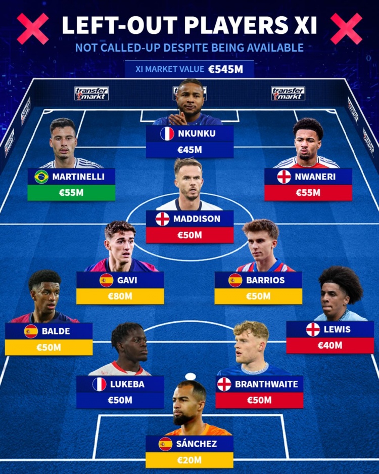 落選國家隊(duì)陣容(總價5.45億歐,不包含傷缺球員):