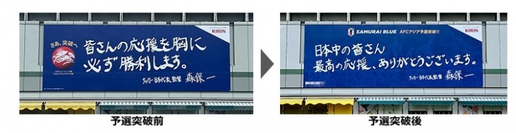 據(jù)日本足協(xié)報(bào)道,在日均人流量達(dá)300萬的日本新宿地鐵站南面出口的一處看板上,在世預(yù)賽前后都換上了森保一親筆寫下的感謝語。據(jù)悉,自3月16日到鎖定世界杯參賽資格前,看板內(nèi)容為:“我們會將大家的聲援銘記在心,與巴林一戰(zhàn)我們一定會取勝。”