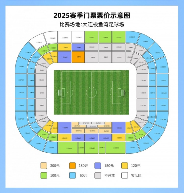 本賽季,大連英博的主場仍是梭魚灣足球場。俱樂部將主場看臺散票劃分為6個區(qū)域,每個區(qū)域票價不同,分別為60元、100元、120元、150元、180元和300元。
