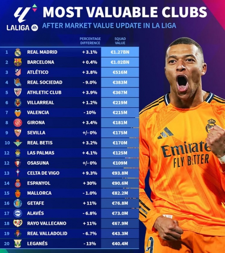 3月22日訊 《轉(zhuǎn)會市場》更新了西甲球員身價,并列出了最新的西甲球隊身價榜,皇薩競分列前三。