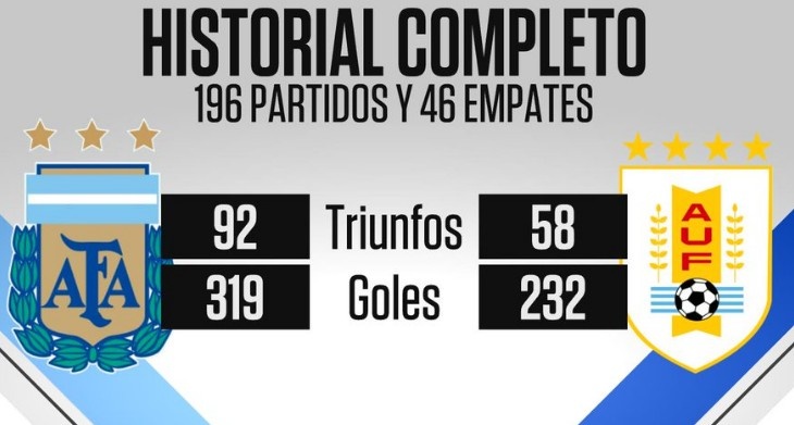 據(jù)統(tǒng)計,這是阿根廷與烏拉圭兩支南美老牌強隊歷史上第196次交鋒,阿根廷的戰(zhàn)績?yōu)?2勝46平58負,打進319球,丟232球。