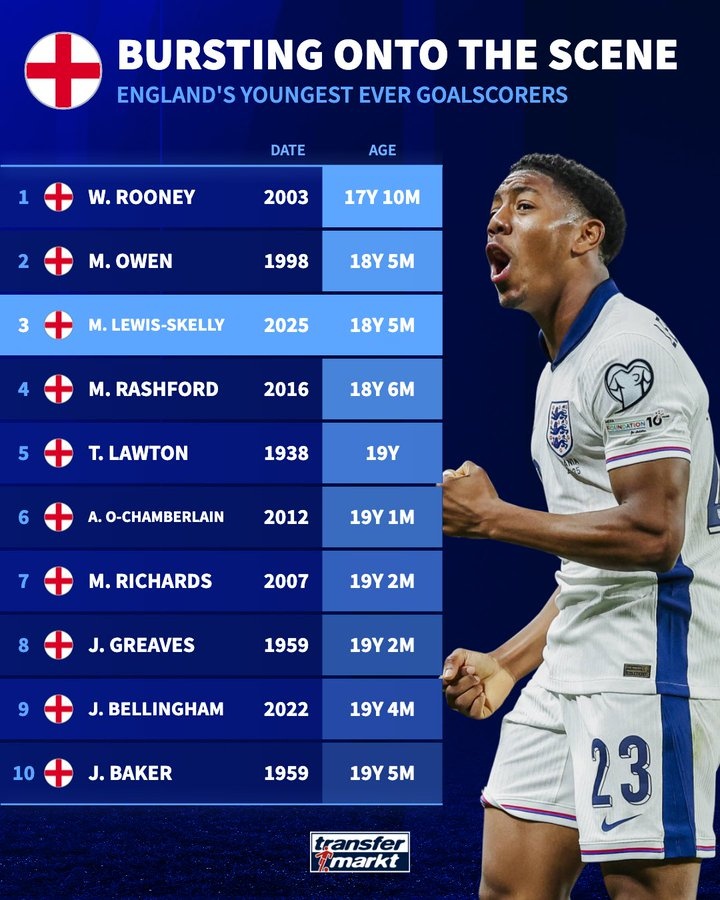 3月22日訊 今天凌晨,英格蘭2-0擊敗阿爾巴尼亞,斯凱利首秀破門,德國轉(zhuǎn)會市場統(tǒng)計,斯凱利是英格蘭隊史第三年輕的進球者。