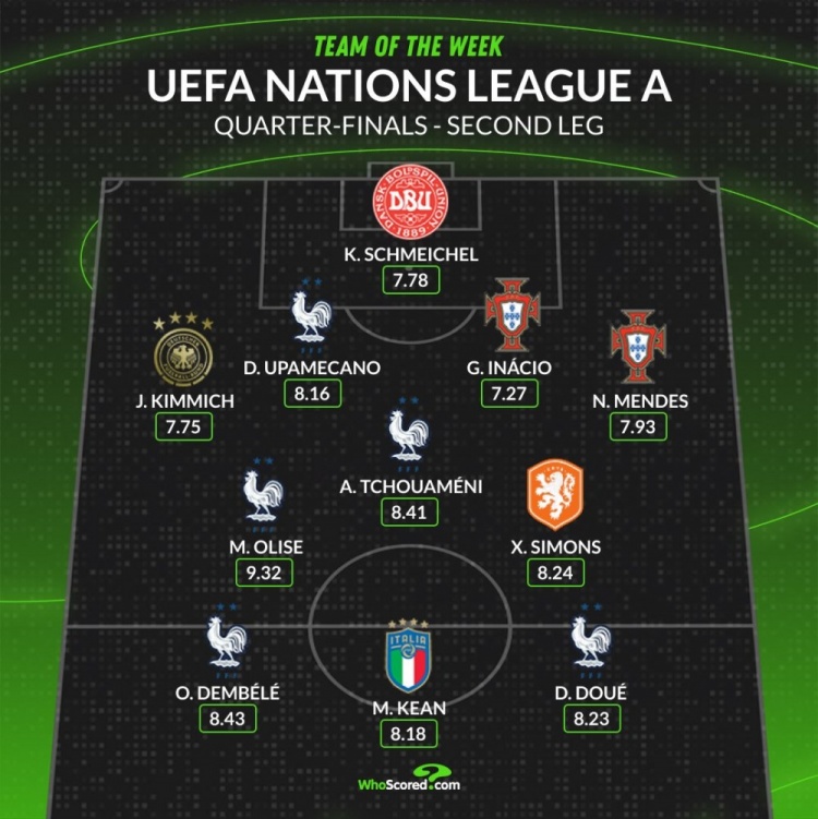 3月24日訊 歐國聯(lián)八強(qiáng)戰(zhàn)次回合已經(jīng)完賽,whoscored也統(tǒng)計(jì)了本輪評(píng)分最佳陣容,法國隊(duì)5將在列。