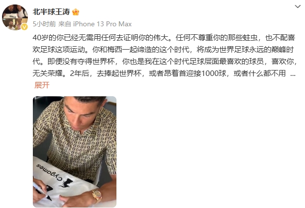 C羅迎來(lái)40歲生日,王濤在微博曬出C羅簽名照,并寫(xiě)下一段話祝福C羅。