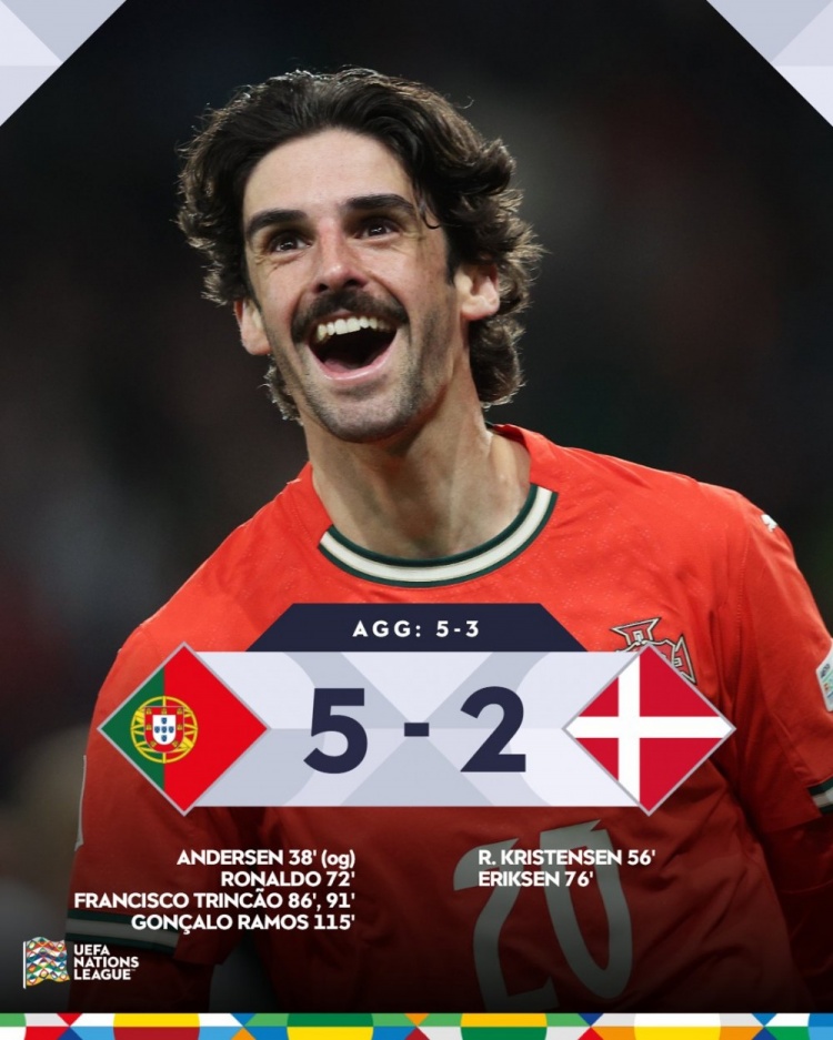 3月24日訊 歐國聯(lián)八強(qiáng)戰(zhàn)次回合,葡萄牙加時賽5-2擊敗丹麥,總比分5-3晉級四強(qiáng),半決賽將戰(zhàn)德國。