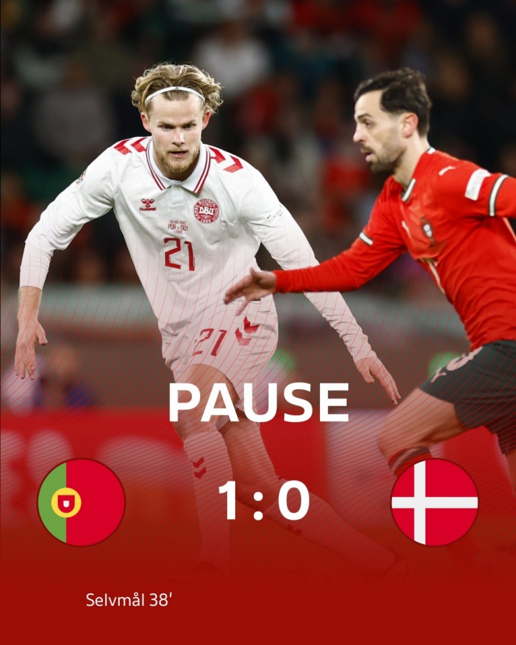 3月24日訊 北京時間3月24日03:45,歐國聯(lián)八強戰(zhàn)次回合葡萄牙迎戰(zhàn)丹麥的比賽在阿爾瓦拉德球場進行,上半場C羅開場造點+點射被撲,達洛特頭球造險,B費角球造安德森解圍自擺烏龍,半場結束,葡萄牙1-0丹麥。