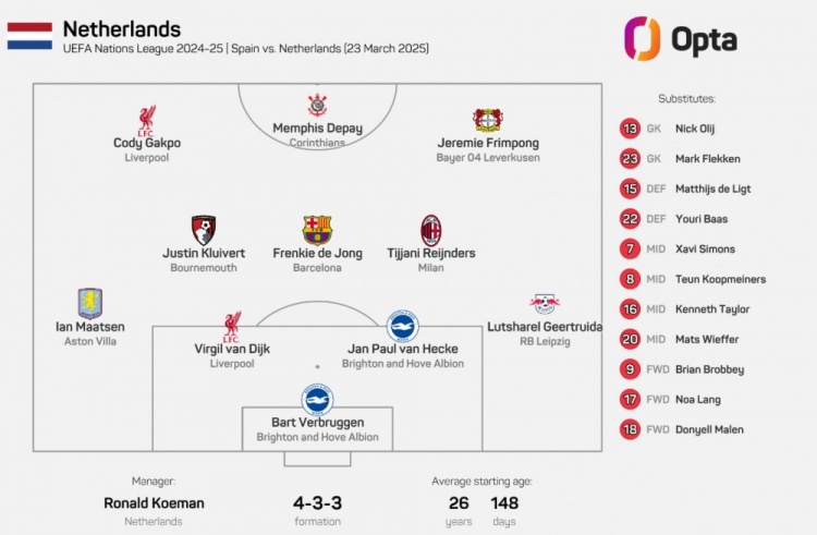 3月24日訊 歐國聯(lián)1/4決賽次回合,荷蘭前往客場挑戰(zhàn)西班牙。本場比賽,荷蘭主帥科曼排出了一套沒有任何荷甲球員的首發(fā)陣容,2017年11月9日以來首次出現(xiàn)如此局面。