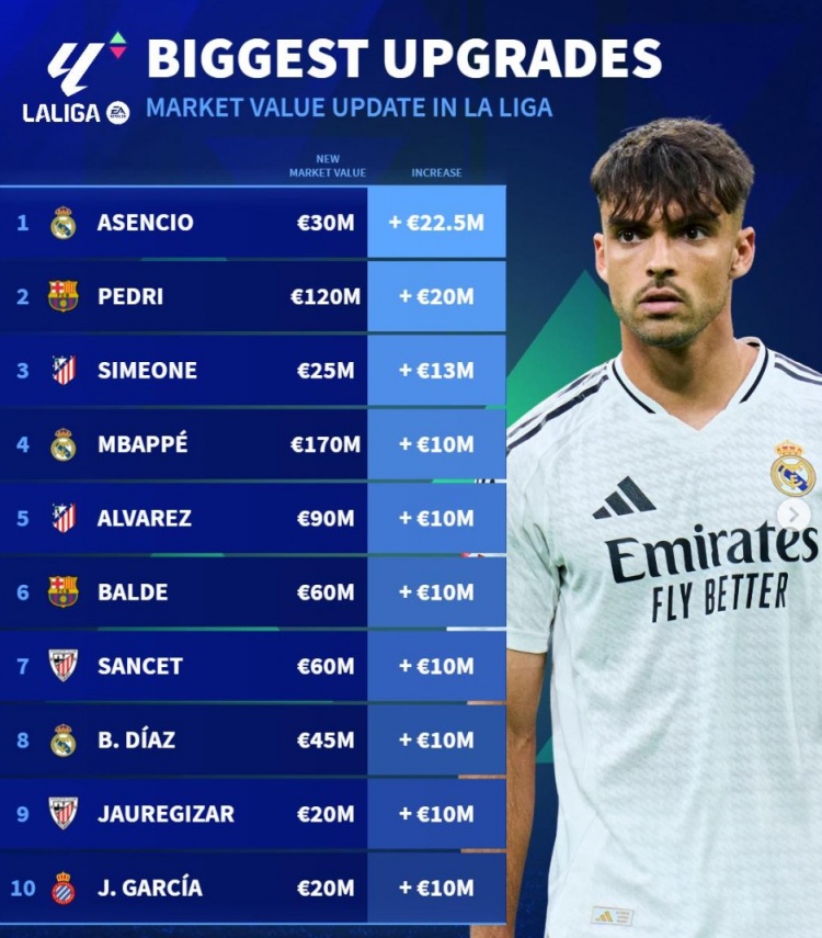 3月24日訊 《轉(zhuǎn)會市場》統(tǒng)計(jì)了西甲球員身價(jià)更新后的升值最多情況,勞爾-阿森西奧力壓佩德里居首。