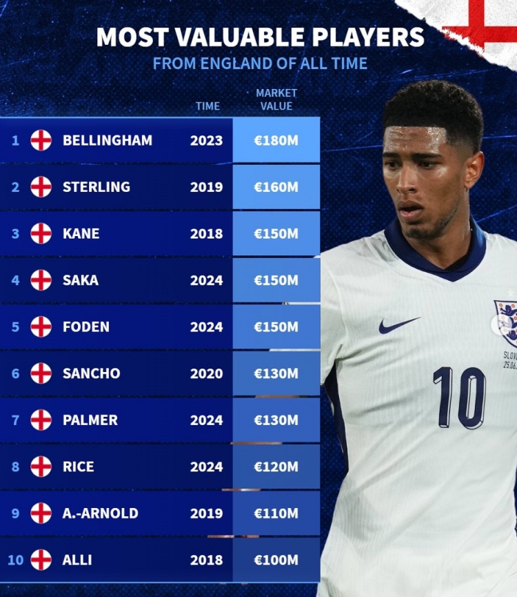 3月25日訊 英格蘭將在本輪世預賽主場迎戰(zhàn)拉脫維亞,《轉(zhuǎn)會市場》也統(tǒng)計了英格蘭球員歷史身價前十均達到1億歐元大關(guān)。