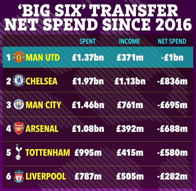 BIG6近9年支出:曼聯(lián)凈支出10億鎊!切爾西支出近20億 利物浦墊底