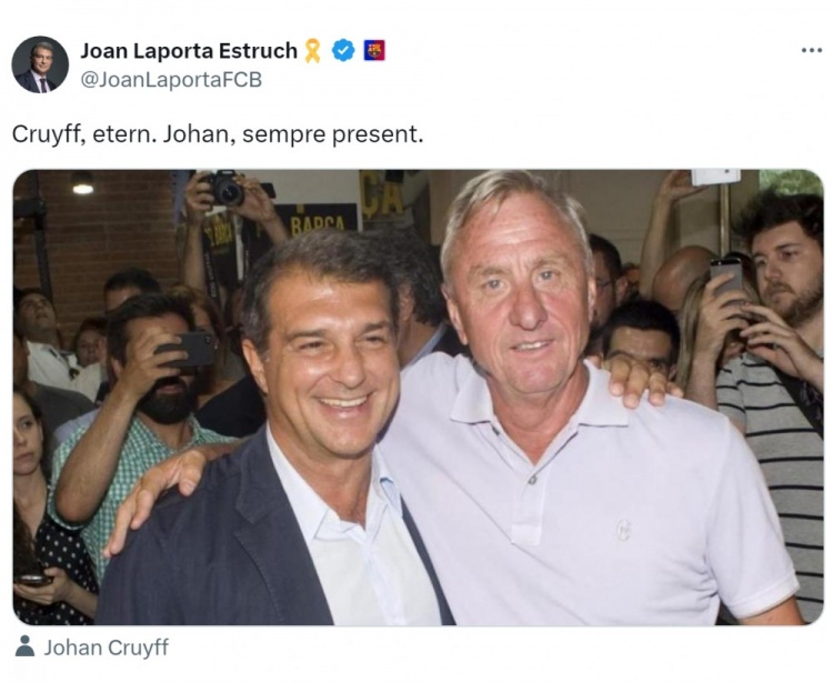 3月25日訊 巴薩俱樂部主席拉波爾塔更新社媒動態(tài),悼念克魯伊夫。克魯伊夫逝世九周年之際,拉波爾塔在社交媒體上曬出與這位俱樂部傳奇的合照,并配文:“克魯伊夫,永恒不朽;約翰,永伴我們?!?/p> 標(biāo)簽: 足球 西甲 巴塞羅那