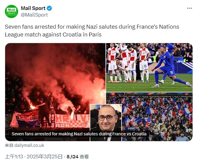 3月25日訊 《每日郵報(bào)》報(bào)道,巴黎當(dāng)局證實(shí),七名在法國(guó)vs克羅地亞的歐國(guó)聯(lián)比賽中行納粹禮的球迷已被拘留。