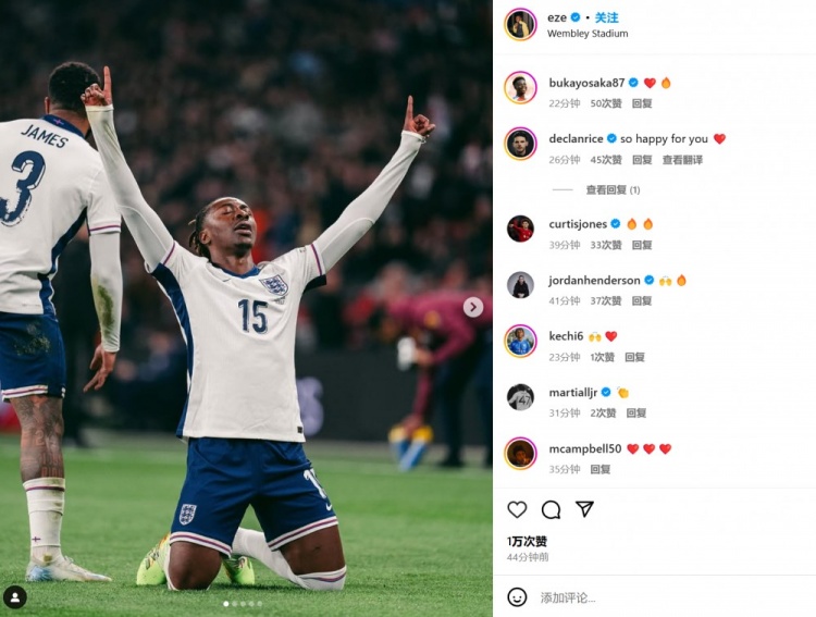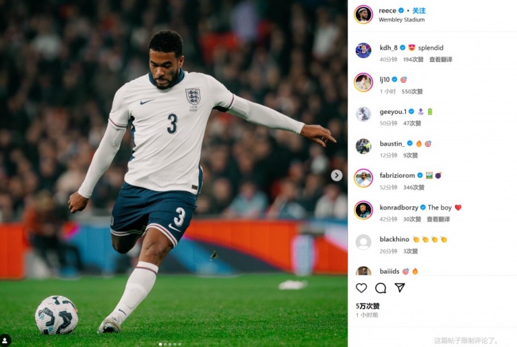 兩人也都在賽后通過社媒曬出自己的比賽照,但并未附加文字內(nèi)容。賴斯和霍爾等隊(duì)友紛紛送上鼓勵(lì):“為你感到高興”、“棒極了”…