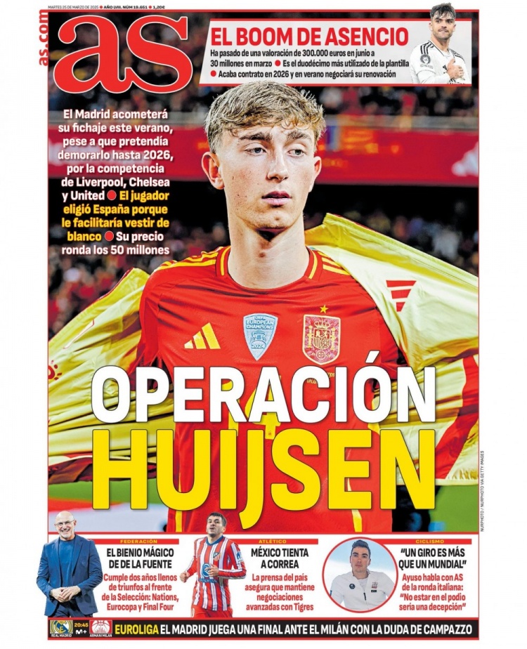懷森成為《阿斯報》3月25日的封面人物,媒體指出,皇馬對這位19歲中衛(wèi)感興趣,盡管伯恩茅斯打算將懷森留到2026年,但考慮到面臨利物浦、切爾西和曼聯(lián)的競爭,皇馬打算今夏就采取行動簽下他。