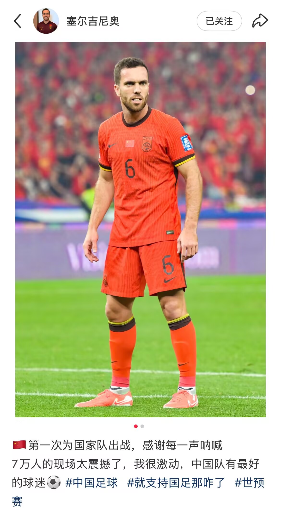 塞爾吉尼奧:“第一次為國(guó)家隊(duì)出戰(zhàn),感謝每一聲吶喊。7萬(wàn)人的現(xiàn)場(chǎng)太震撼了,我很激動(dòng),中國(guó)隊(duì)有最好的球迷。”
