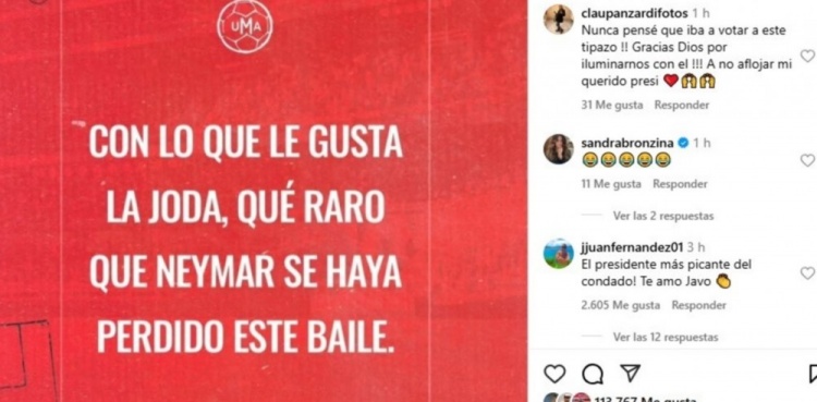 在INS上,米萊嘲諷了本場(chǎng)比賽缺陣的內(nèi)馬爾,他寫(xiě)道:內(nèi)馬爾是如此熱愛(ài)聚會(huì),他這次缺席讓人感到奇怪。