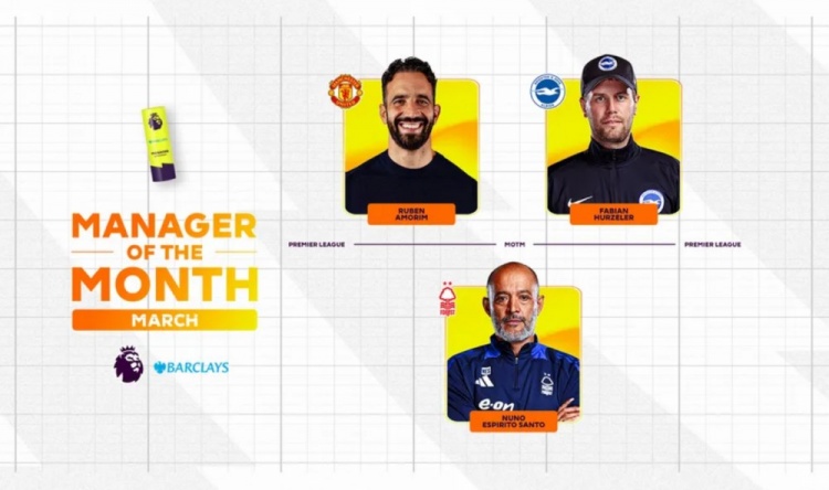 3月27日訊 英超官方公布3月最佳教練候選,曼聯(lián)主帥阿莫林、布萊頓主帥赫爾澤勒、諾丁漢森林主帥努諾三人獲提名。