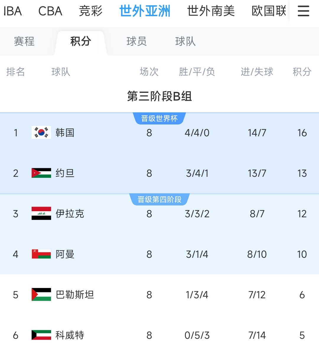 18強賽B組積分榜上,巴勒斯坦積6分排名小組第5,依然存在小組前四晉級附加賽的希望。在18強賽前8輪比賽中,巴勒斯坦取得1勝3平4負,其中兩回合交手韓國隊均取得平局。
