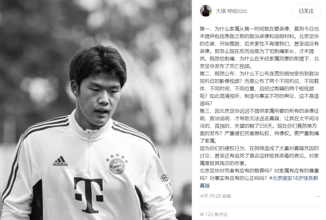 第三、因北京足協(xié)遲遲不提供家屬所要的所有的錄像證明,救治說明,才導(dǎo)致無法送走嘉璇,讓其在太平間冷冷的,孤獨(dú)的,失望的躺了已8天。現(xiàn)在你們竟然單方面的發(fā)布?嚴(yán)重侵犯死者隱私權(quán)、肖像權(quán)。更嚴(yán)重刺痛了家屬。