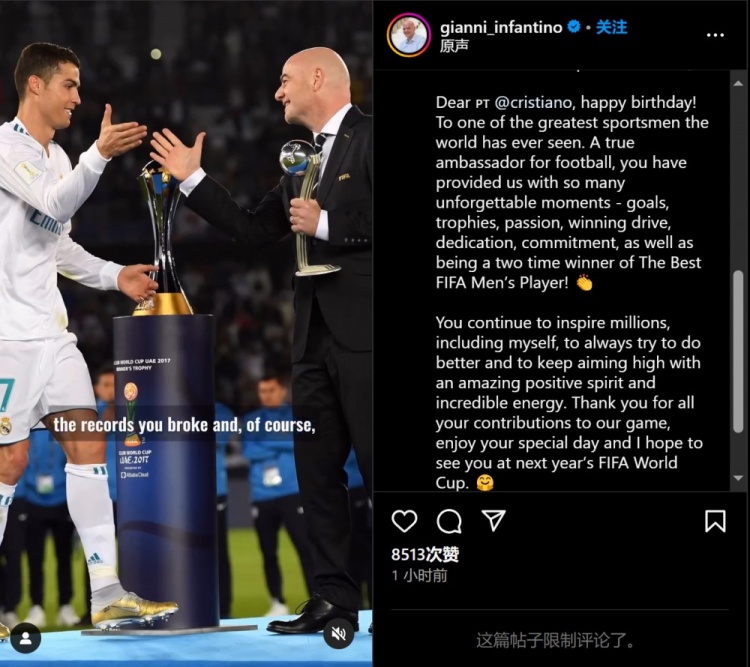 因凡蒂諾寫道:親愛的C羅,生日快樂!向世界上最偉大的運動員之一致敬。作為真正的足球大使,你為我們提供了如此多令人難忘的時刻——進球、獎杯、激情、獲勝的動力、奉獻、承諾,以及兩次當(dāng)選FIFA最佳球員!????