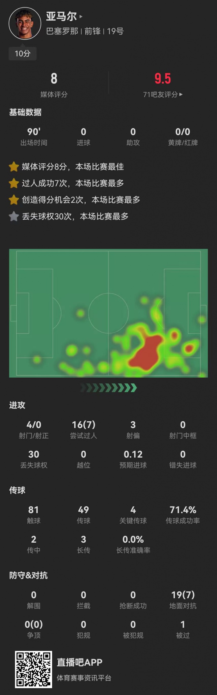 3月28日訊 巴薩在本輪西甲3-0完賽奧薩蘇納,亞馬爾本場數(shù)據(jù)如下: