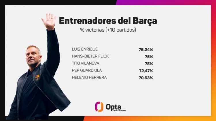 數(shù)據(jù)統(tǒng)計顯示,弗里克在巴薩各項賽事44場取得33勝,75%勝率追平比拉諾瓦。在隊史執(zhí)教超過10場的教練中,勝率僅次于恩里克(76.24%)。瓜迪奧拉勝率72.47%位列第四,埃倫尼奧-埃雷拉以70.63%勝率位列第五。
