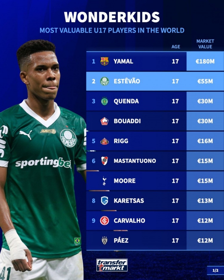 3月29日訊 《轉(zhuǎn)會市場》完成了球員身價更新,并列出了U17球員身價榜,亞馬爾無懸念斷崖領(lǐng)跑,多位球員已經(jīng)被切爾西預(yù)訂。