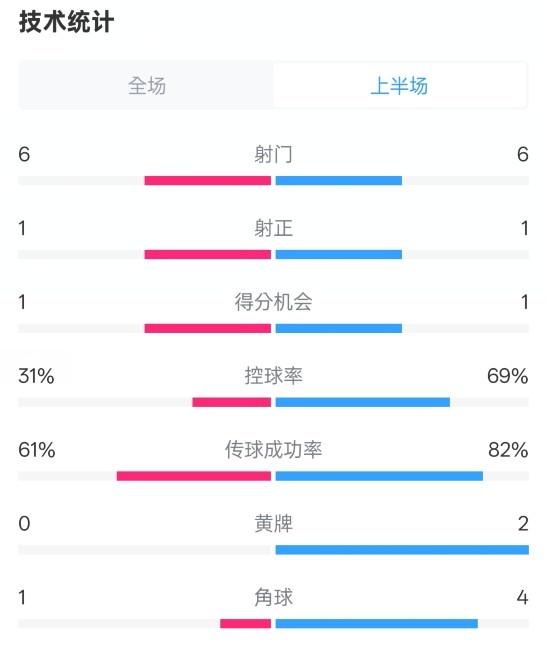 半場(chǎng)數(shù)據(jù)如下(阿森納在后):