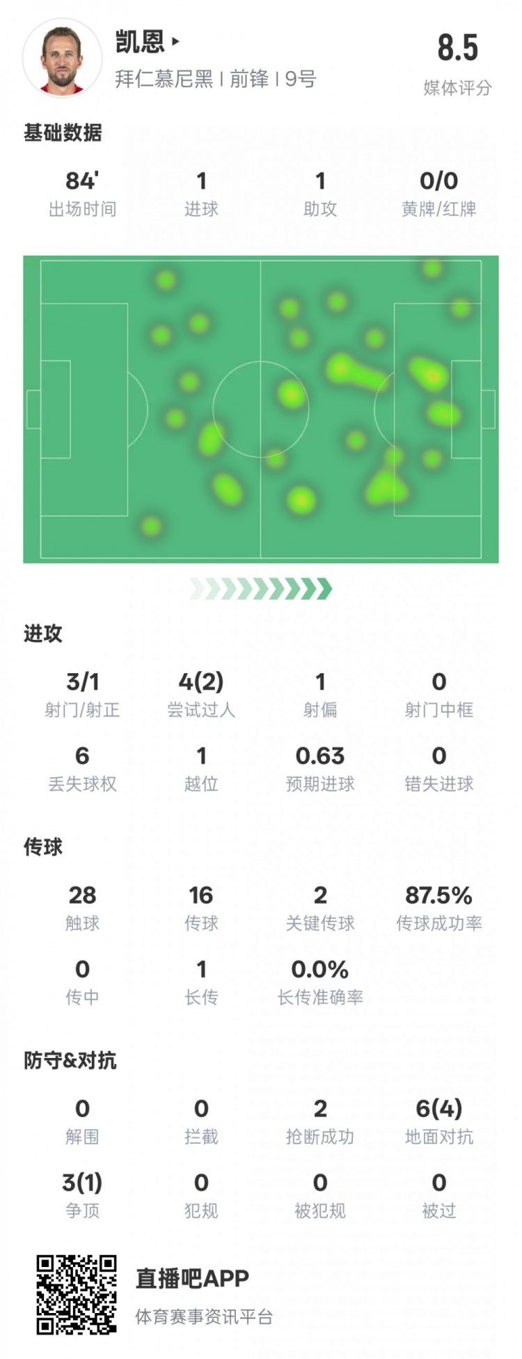 3月30日訊 德甲第27輪,拜仁對陣圣保利,凱恩首發(fā)出戰(zhàn),傳射建功,還送出2次關鍵傳球,評分8.5。