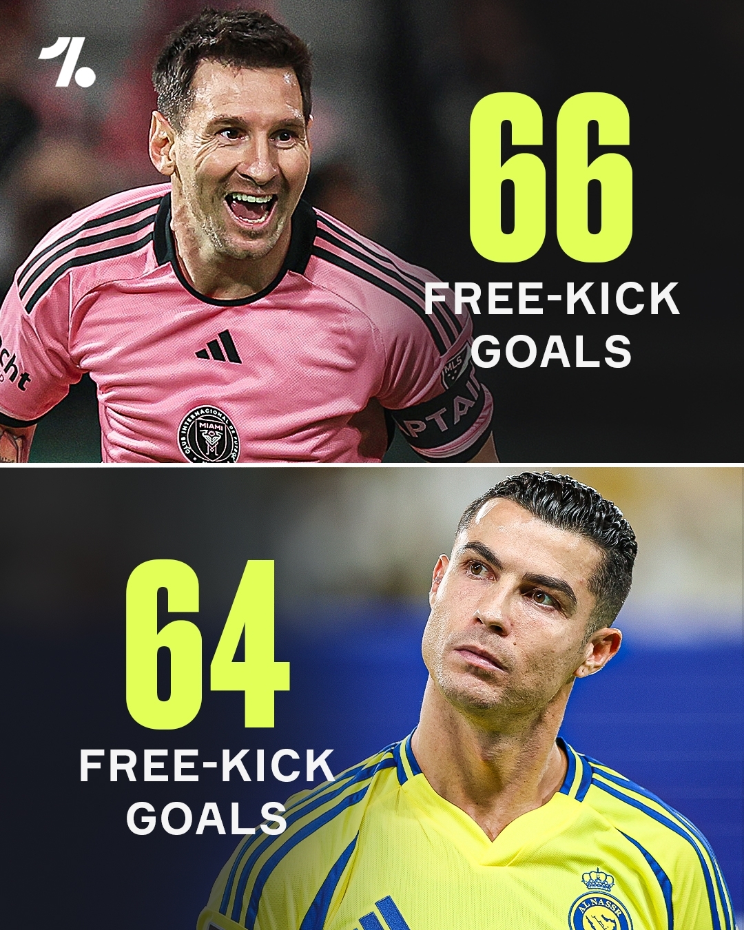 而梅西和C羅職業(yè)生涯至今分別打進(jìn)了66粒任意球和64粒任意球。