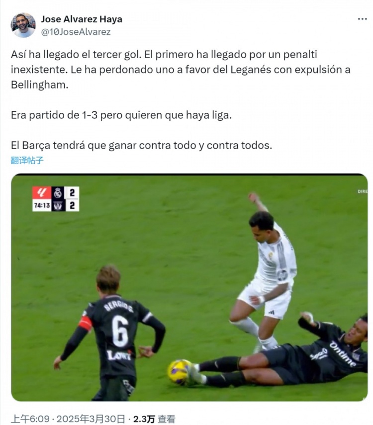 “皇馬任意球的犯規(guī)根本不該判,第三個(gè)進(jìn)球就是這樣來的。皇馬的第一個(gè)進(jìn)球也是通過不存在的點(diǎn)球打進(jìn),裁判沒有判給萊加內(nèi)斯一個(gè)點(diǎn)球,也沒有將貝林厄姆罰下。”