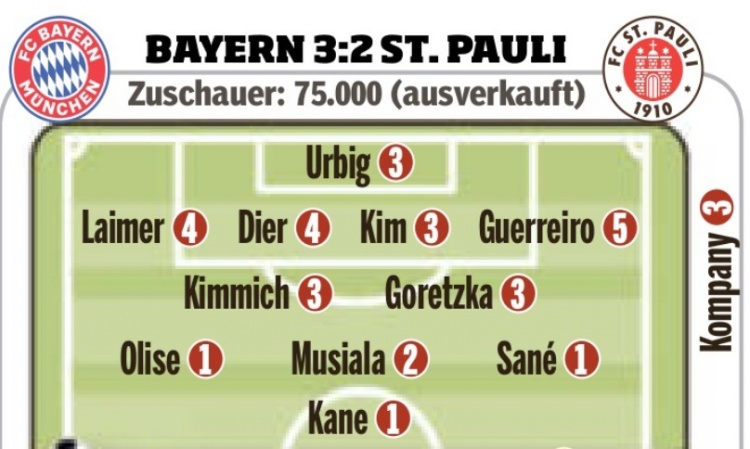 3月30日訊 拜仁在本輪德甲3-2險(xiǎn)勝圣保利,《圖片報(bào)》也在賽后為球員進(jìn)行了評分。
