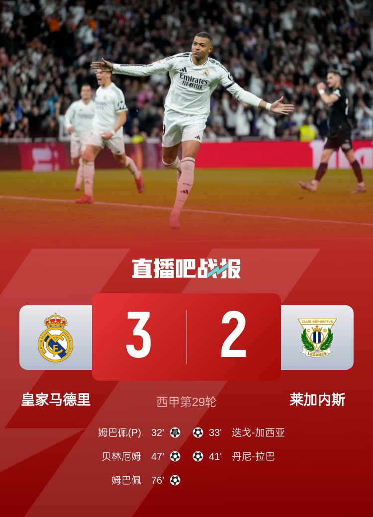 西甲第29輪,皇馬3-2萊加內(nèi)斯,聯(lián)賽三連勝。上半場,居勒爾造點,姆巴佩點射,迭戈-加西亞迅速扳平,丹尼-拉巴破門反超;下半場,貝林厄姆建功,姆巴佩再下一城。