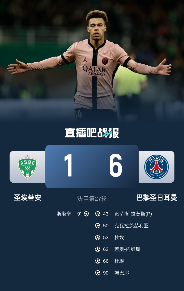 法甲第27輪,巴黎6-1大勝圣埃蒂安,暫以22分優(yōu)勢領(lǐng)跑。上半場,斯塔辛首開紀(jì)錄,貢薩洛-拉莫斯點射扳平;下半場,克瓦拉茨赫利亞擴(kuò)大比分,內(nèi)維斯破門,杜埃梅開二度,姆巴耶打進(jìn)一球。