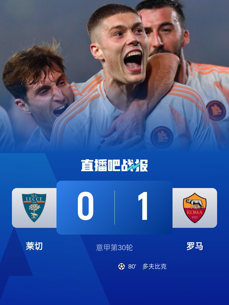 意甲第30輪,萊切0-1羅馬。上半場,科內(nèi)錯失良機(jī);下半場,小曼奇尼進(jìn)球被吹,多夫比克低射制勝。