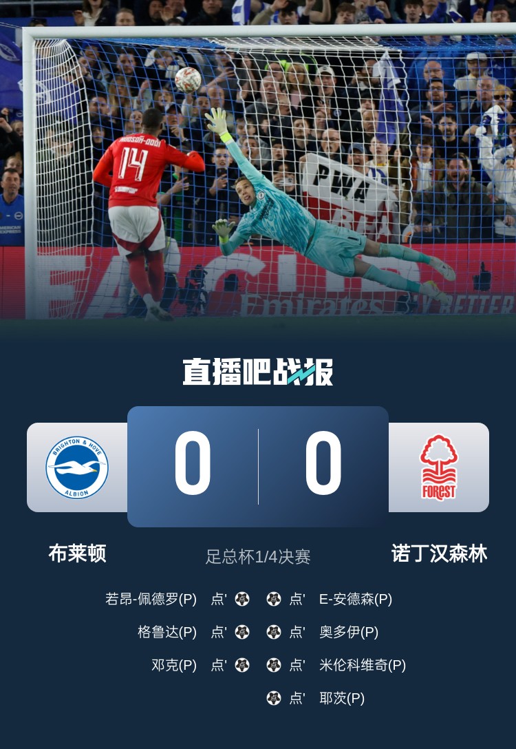 足總杯-布萊頓點球大戰(zhàn)3-4諾丁漢森林遭淘汰 塞爾斯兩撲點