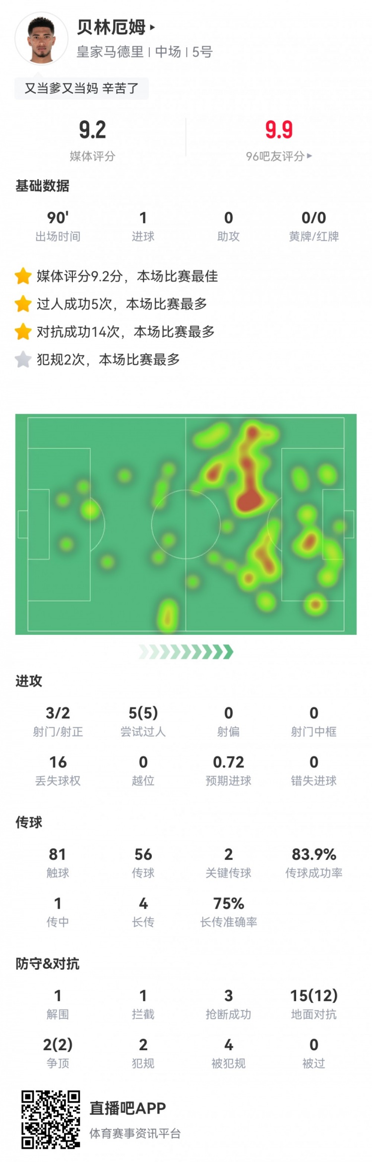 3月30日訊 本輪西甲,皇馬3-2萊加內(nèi)斯。此役貝林厄姆首發(fā)打滿全場,球員全場重點數(shù)據(jù)如下↓