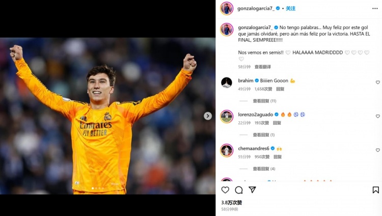 他也在賽后通過社媒曬出自己的慶祝照,并配文:“我高興到不知道該說什么了……我很高興能夠打進這粒永遠不會忘記的進球,但更高興的是取得勝利。永遠要戰(zhàn)斗到最后一刻!半決賽見!馬德里前進!”