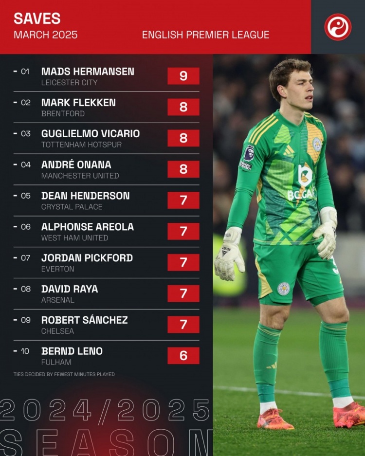 4月1日訊 Squawka統(tǒng)計(jì)了3月份英超門將的撲救次數(shù),并列出榜單,赫爾曼森9次居首,弗萊肯、維卡里奧、奧納納8次并列第二。