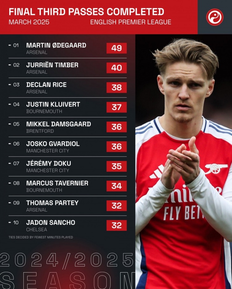 4月1日訊 Squawka統(tǒng)計(jì)了球員在3月份英超比賽中的進(jìn)攻三區(qū)成功傳球次數(shù),并列出榜單,阿森納包攬前三名。