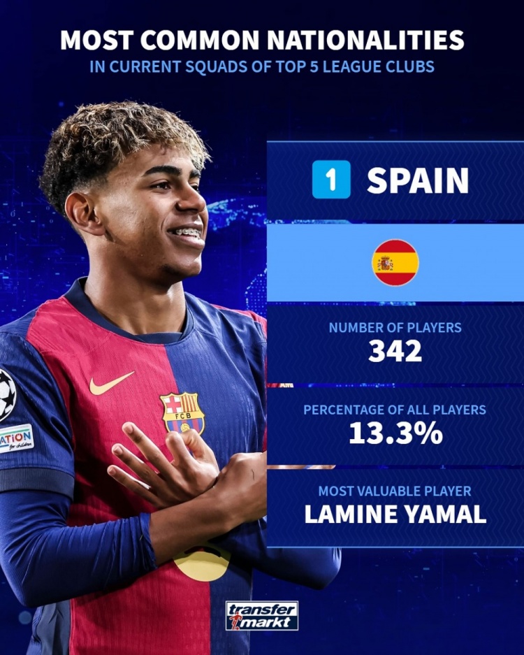 4月1日訊 德國轉(zhuǎn)會市場統(tǒng)計(jì)了五大聯(lián)賽各國球員的數(shù)量,并列出榜單,西班牙342人最多,法國292人次席。