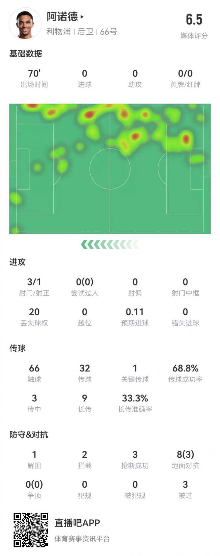 阿諾德本場3被過+2失誤導(dǎo)致對方射門+20丟失球權(quán) 獲評6.5分
