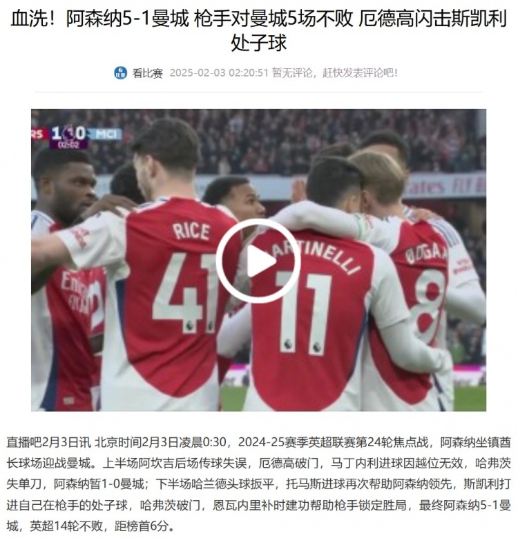 此役過(guò)后,曼城直接痛下決心引援,以6000萬(wàn)歐的高昂溢價(jià)簽下了尼科-岡薩雷斯。而和特爾、沃特金斯等人傳出緋聞的阿森納最終按兵不動(dòng),并未在冬窗最后時(shí)刻引進(jìn)前鋒。