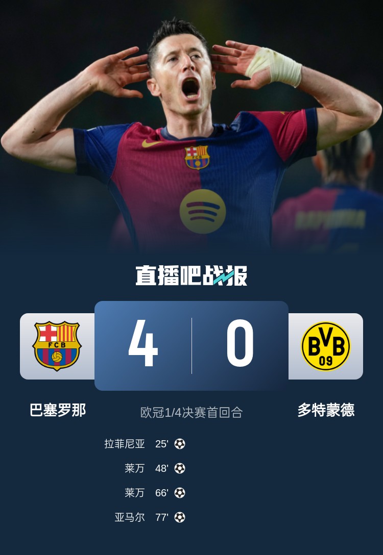 歐冠8強(qiáng)首回合,巴薩4-0大勝多特!萊萬雙響,亞馬爾、拉菲尼亞破門!懸念已無了嗎?